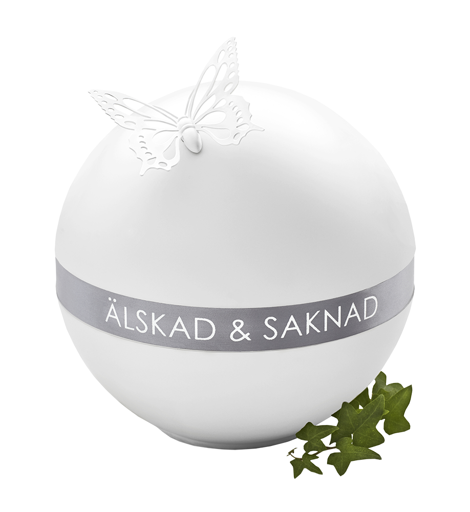 En vacker och miljövänlig vit urna med sidenband och fjäril. TELLUS® är tillverkad av 100 % förgänligt biologiskt nedbrytbart material och ger en fridfull återgång till naturens kretslopp. Den eleganta designen och det mjuka sidenbandet, tillgängligt i en rad olika färger, skapar en personlig och värdig hyllning till den avlidne.